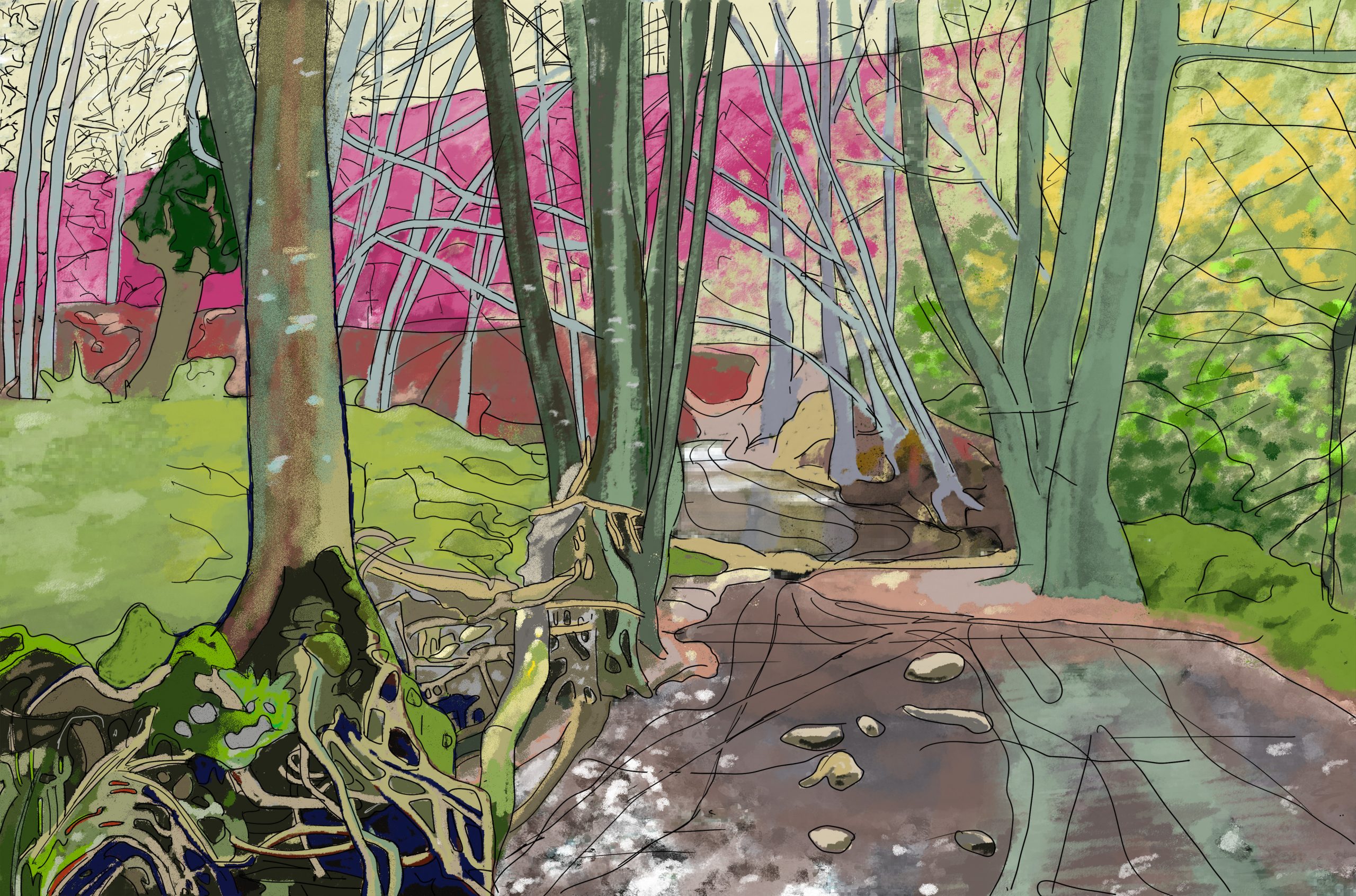 The vertical components, mainly trees, give a feeling of height, whilst the colour pallet creates an impression of depth. The magenta works well against the greens to induce vibrancy. Once again I have been able to use the water to good effect by using it to capture reflections, and an area of interest. The tangled roots in the foreground provide a counterpoint against the more abstract background.